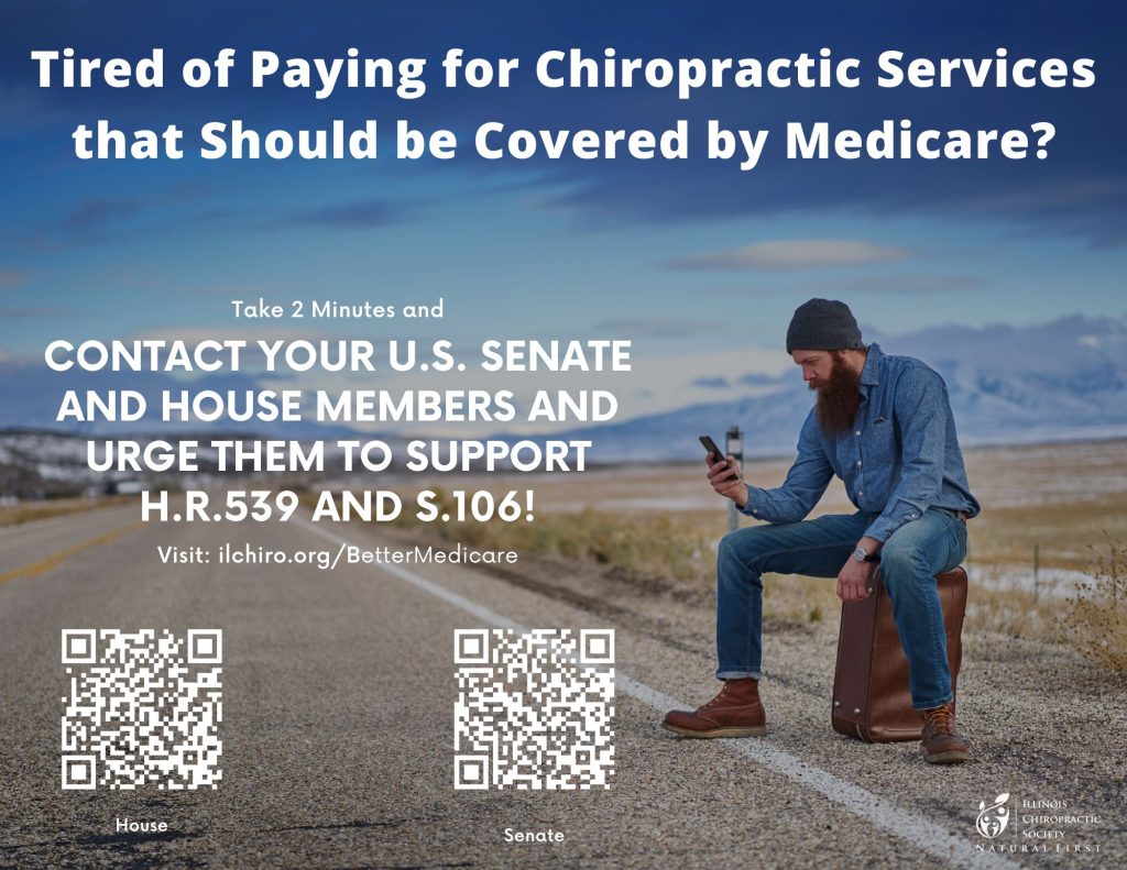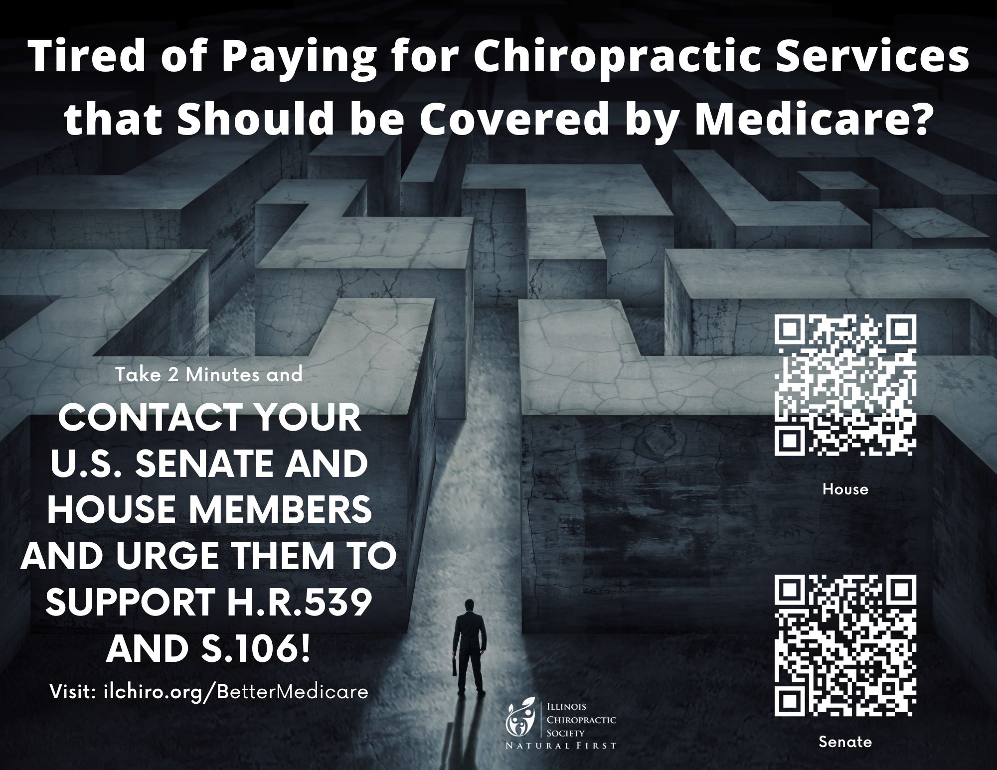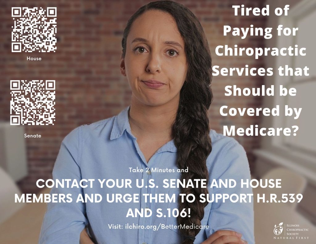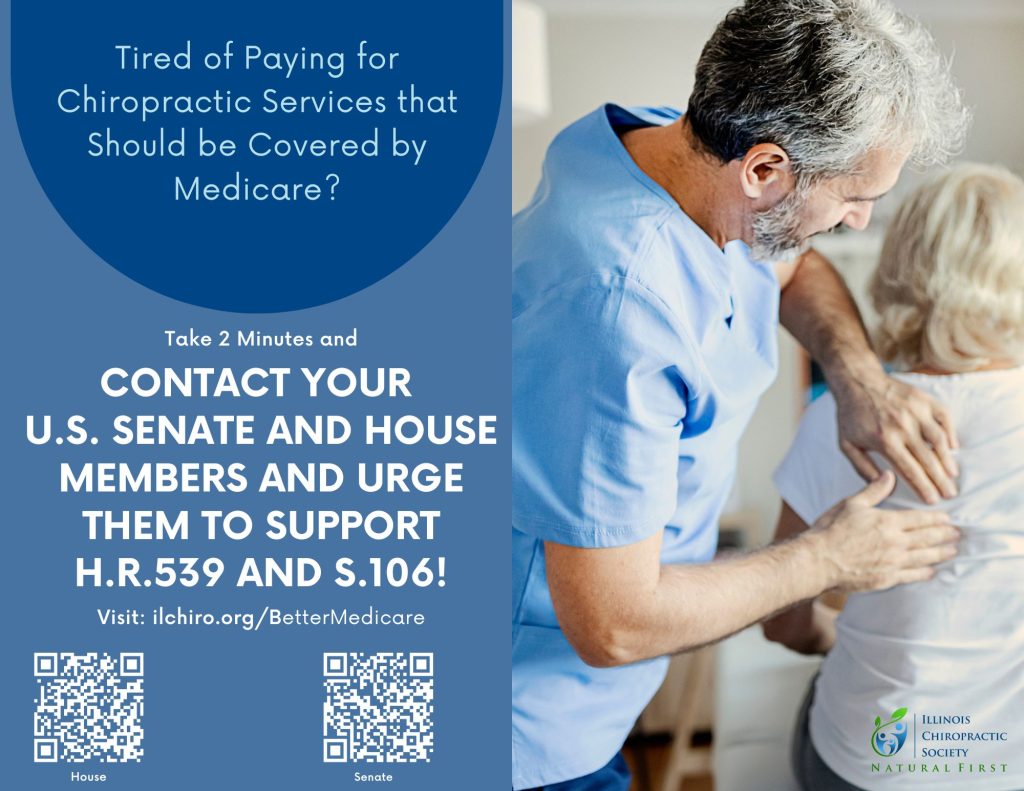 Currently, Medicare will only reimburse chiropractic physicians for one service — spinal manipulation – provided to Medicare patients. However, doctors are professionally bound to provide additional services to accurately diagnose a patient, resulting in undue financial hardship for patients who may not be able to pay out of pocket for all of the required services. Importantly, Medicare already pays other health care providers for these services, but Medicare requires patients to pay for these same services when provided by chiropractic physicians. Therefore, the patient’s ability to choose their provider is limited. You can click on this link to review the talking points. For assistance, please contact Ben Schwarm, Director of Governmental Relations, at Ben@Ilchiro.org or 217/525-1200.