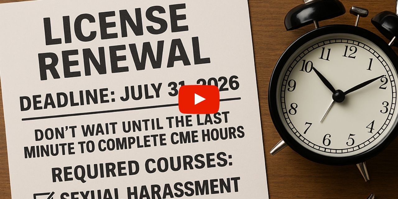 License renewal is due July 31, 2026. Avoid last-minute stress by completing your 150 CME hours, including required courses like sexual harassment, implicit bias, and cultural competency. Start now!