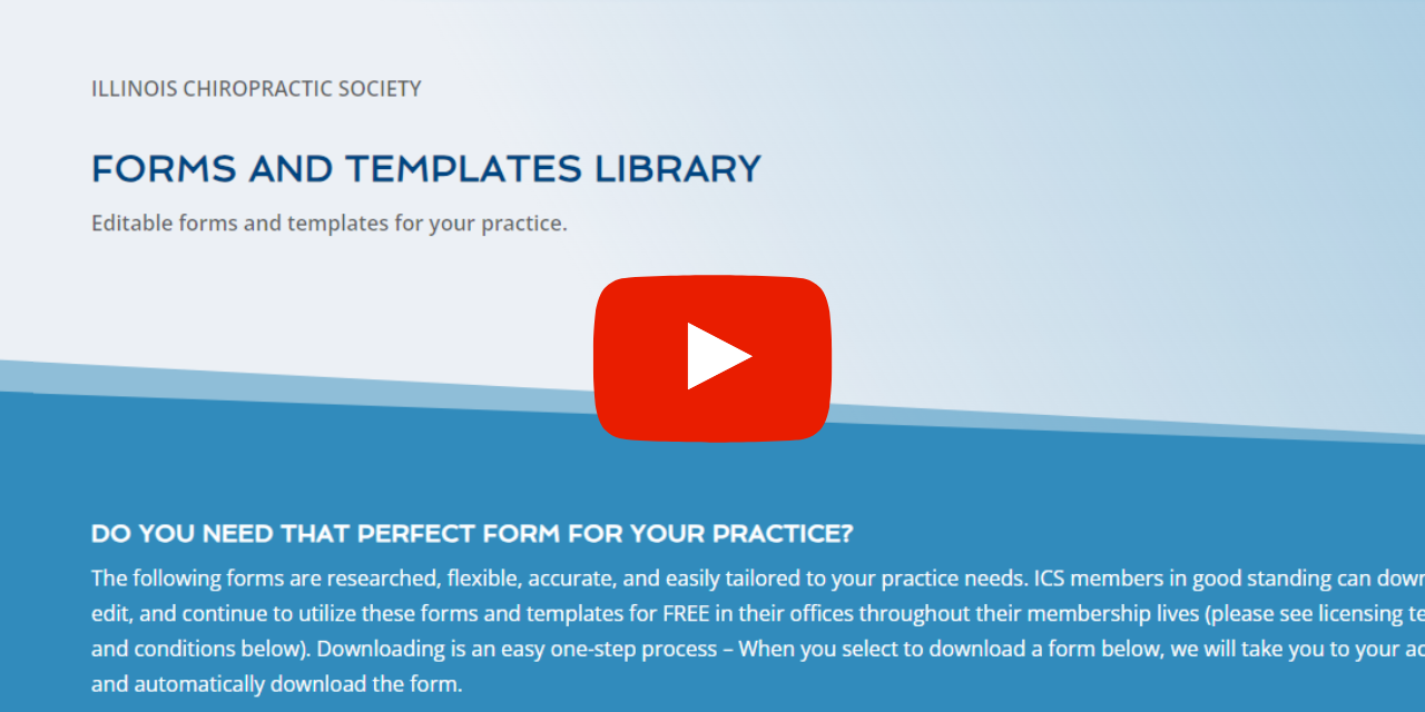 We received a phone call earlier today asking a question about a particular form and if we had one available. And the answer is to almost all of those questions, the answer is yes. In fact, I would encourage you all to go out and check out our lengthy list of forms and templates that we have available for ICS members. You can jump out to ilchiro.org/forms. That’s ilchiro.org/forms we will include that link down below as well. I want you to know that we have a lengthy list of forms that can help you and templates that you can actually employ in your practice because you are a member of the Illinois Chiropractic Society.