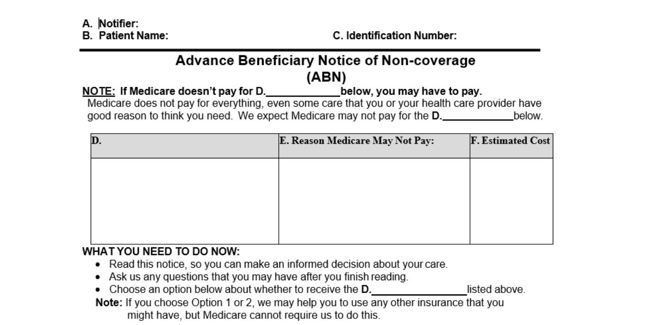 Although the current ABN form is marked with a January 2026 expiration date, CMS has confirmed that it is still undergoing the Paperwork Reduction Act (PRA) review process. In the meantime, providers may continue to use the existing form, even beyond its expiration date, until CMS issues a replacement.