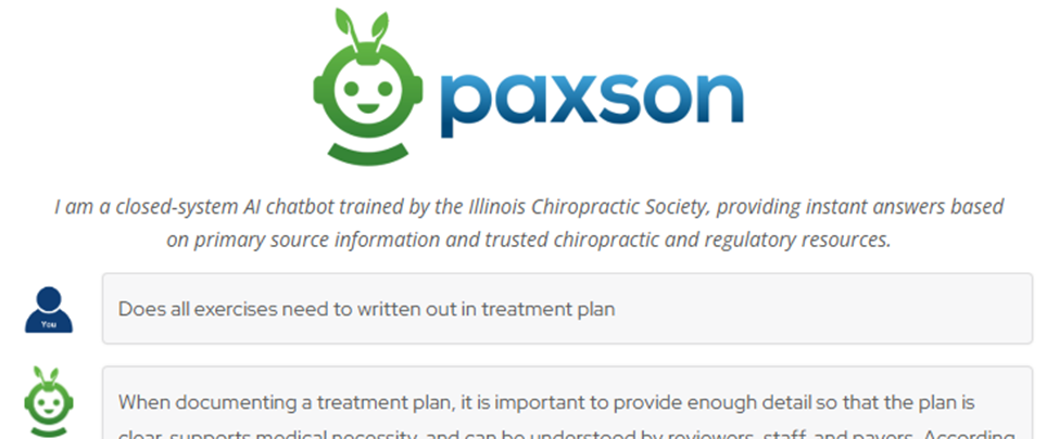 Each month, we feature a real question asked by one of your fellow ICS members through Paxson, our closed-system AI assistant built just for Illinois chiropractic physicians. Paxson provides quick, accurate, and member-directed support on a wide range of topics—from insurance issues and licensure requirements to documentation, compliance to social media posts, and more.
