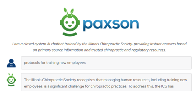 Each month, we feature a real question asked by one of your fellow ICS members through Paxson, our closed-system AI assistant built just for Illinois chiropractic physicians. Paxson provides quick, accurate, and member-directed support on a wide range of topics—from insurance issues and licensure requirements to documentation, compliance to social media posts, and more.